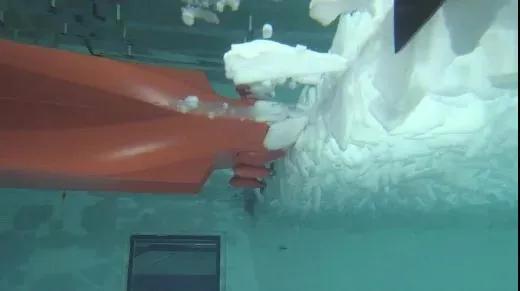 通过先后两次的冰模试验,全面测试了在北极航行船只的破冰工况,包含中厚陈年冰航道开辟试验、航道突破试验、流冰试验和冰脊穿越试验。