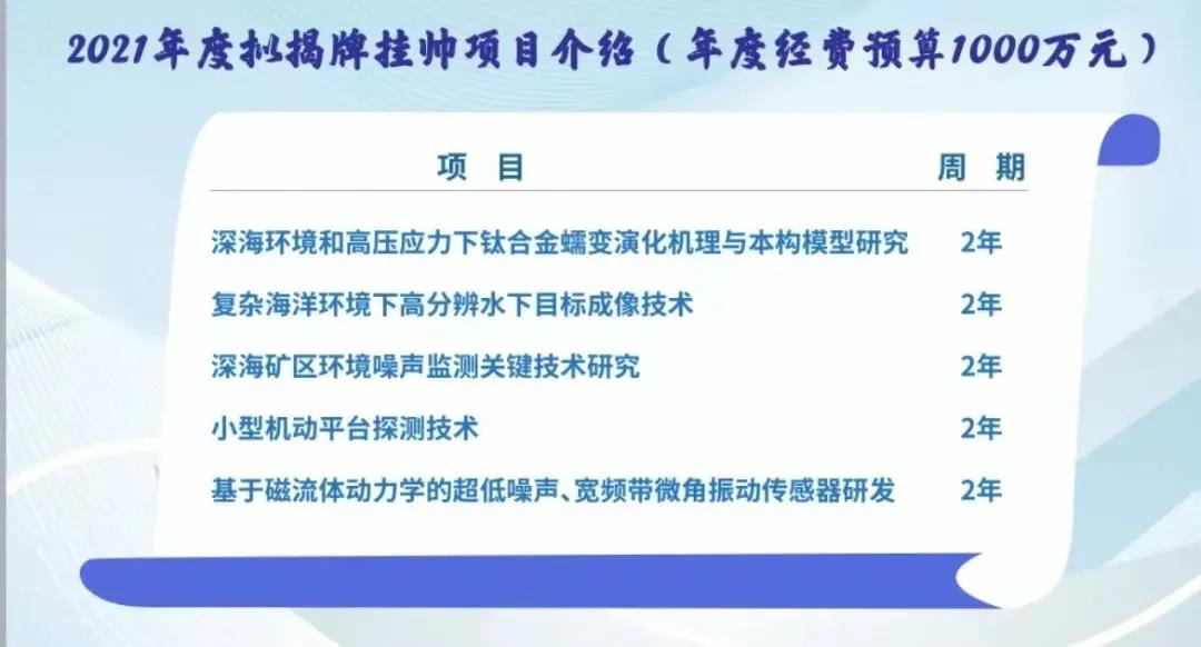 本次5个揭榜挂帅项目分别为:深海环境和高压应力下钛合金蠕变演化机理与本构模型研究、复杂海洋环境下高分辨水下目标成像技术、深海矿区环境噪声监测关键技术研究、小型机动平台探测技术、基于磁流体动力学的超低噪声、宽频带微角振动传感器研发。