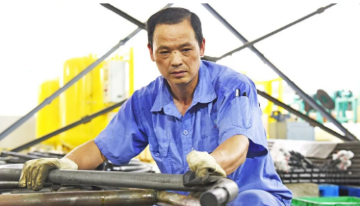 高压油管车间,汗流浃背的操作工人正在操作弯管机加工高压油管。