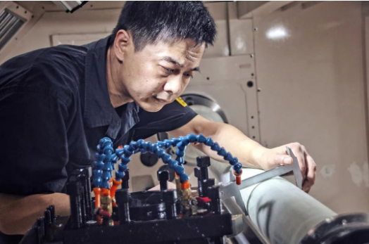 七〇八所海迅公司生产部的员工计师傅虽已汗如雨下,仍专注于铣床加工之中。