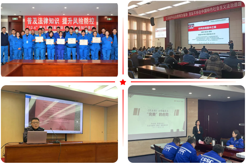 ▲ 江南造船、中船九院、重齿公司、河柴重工、江淮重工、七〇八所、七〇九所、七一六所等单位通过线上与线下相结合的方式开展法律知识竞赛;七一七所、七二二所等单位拍摄制作普法微视频;中船澄西、中船财务、中船投资、物资公司、各平台型上市公司、中船绿洲、中船风电、汉光重工、长江科技、七一〇所、七一一所、上船院等多家单位举办专题法治讲座;七六〇所举办民法典热点问题交流沙龙;八院组织业务部门重点岗位人员旁听庭审。