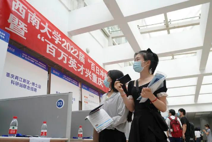 图片▲在位于重庆市北碚区的西南大学,应届毕业生参加“百万英才兴重庆”招聘会(2022年5月13日摄)。用人单位提供了涉及教育、人工智能、汽车制造等领域的3000多个岗位供毕业生选择。新华社发(秦廷富 摄)