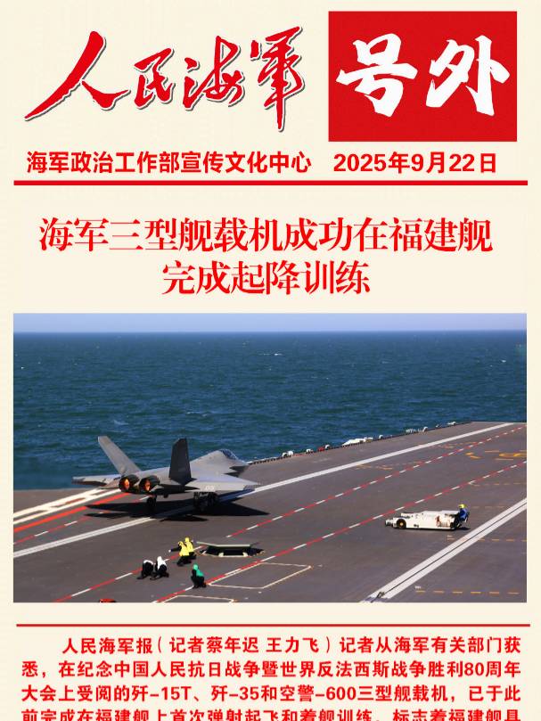 记者从海军有关部门获悉,在纪念中国人民抗日战争暨世界反法西斯战争胜利80周年大会上受阅的歼-15T、歼-35和空警-600三型舰载机,已于此前完成在福建舰上首次弹射起飞和着舰训练,标志着福建舰具备了电磁弹射和回收能力。这是我国航母发展历程中取得的又一次突破,对推进海军转型建设具有里程碑意义。