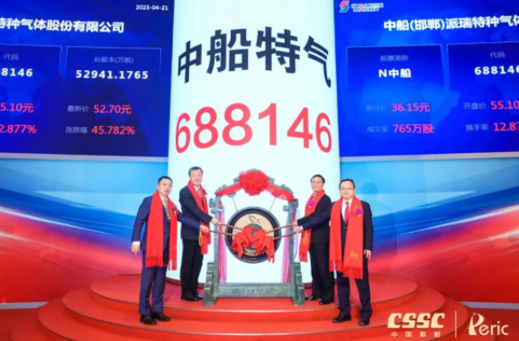 4月21日,中国船舶集团有限公司旗下中船(邯郸)派瑞特种气体股份有限公司(简称:中船特气,证券代码:688146)首次公开发行A股上市仪式在上海证券交易所举行。这是中国船舶集团旗下第12家上市公司,也是集团公司重组后首家在科创板公开发行A股的上市公司。中国船舶集团党组书记、董事长温刚出席仪式,党组成员、总会计师贾海英出席仪式并致辞,党组成员、副总经理盛纪纲出席仪式。