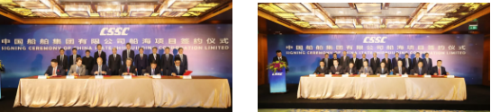 ????主要签约项目包括:中国船舶集团所属重庆川东船舶重工有限责任公司与中远海运(上海)有限公司1.38万吨不锈钢化学品船项目;中国船舶集团所属大连船舶重工集团有限公司与招商轮船VLCC项目;中国船舶集团所属上海外高桥造船有限公司与工银租赁21万吨散货船项目、外高桥造船与EPS公司20.9万吨双燃料散货船项目;中国船舶集团所属江南造船(集团)有限责任公司与太平洋气体公司VLEC项目、江南造船与 SINOGAS86000立方米VLGC项目、江南造船与UECC公司3600车汽车滚装船项目、江南造船与派格达克公司22000方乙烯船项目;中国船舶集团所属广船国际有限公司与斯坦纳公司5万吨甲醇双燃料油船项目、广船国际与EPS公司LNG双燃料苏伊士油船项目、中国船舶集团所属沪东中华造船(集团)有限公司与MOL18600立方LNG加注船项目;中国船舶集团所属武船集团青岛北海船舶重工有限责任公司与中国船舶集团所属中船租赁21万吨散货船项目、中国船舶集团所属中船澄西船舶修造有限公司与国银租赁85000吨散货船项目、重庆川东船舶重工与重庆冠达世纪游轮650客游轮项目;中国船舶租赁与 Golar LNG 船舶改装融资租赁项目、中国船舶租赁与SINOGAS86000立方米VLGC融资租赁项目;中船租赁与山东海运21万吨散货船融资租赁项目、中船租赁与Navig 8 成品油船联合投资协议、中船租赁与新加坡星展银行VLCC融资协议。