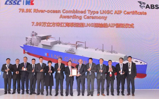 ????中国船舶集团所属沪东中华造船(集团)有限公司推出了包括LNG-FSRU船、ARC7破冰型LNG船、350MV LNG发电船、V2.0版18600立方米LNG加注船在内的6款新船为中国船舶集团代言。12月4日,沪东中华获得了由美国船级社颁发的全球首例7.99万立方米江海联运型LNG船AiP证书、由DNV GL船级社颁发的全球最大25000TEU集装箱船AiP证书。