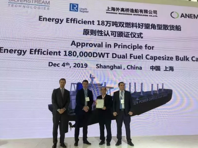 ????12月4日,中国船舶集团所属上海外高桥造船有限公司隆重推出两款集多种节能环保技术于一身的“Energy Efficient”18万吨级双燃料好望角型散货船和30万吨级双燃料超大型原油船新船型。展会上,英国劳氏船级社为18万吨级双燃料好望角型散货船颁发了AiP证书;英国劳氏船级社和美国船级社为30万吨级双燃料超大型原油船颁发了AiP证书。