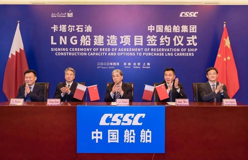 ????4月22日,中国船舶集团与卡塔尔石油公司在中国北京、上海及卡塔尔多哈三地以“云签约”方式联合签署“中国船舶—卡塔尔石油液化天然气(LNG)船建造项目”协议,所涉订单总金额超过200亿元人民币。这是卡塔尔天然气项目首批订单,也是中国船企迄今承接的金额最大的造船出口订单。中国船舶集团和卡塔尔石油将强强联手,依托各自优势在能源运输、装备制造及全球化服务等领域开展广泛合作。