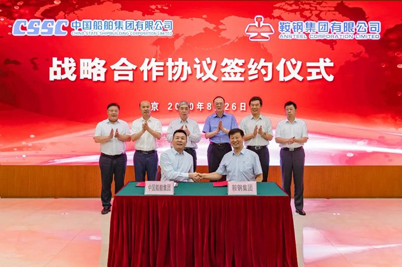8月26日,中国船舶集团有限公司与鞍钢集团有限公司在京签署战略合作协议。中国船舶集团党组书记、董事长雷凡培,党组成员、副总经理冯永强,鞍钢集团党委书记、董事长谭成旭,党委副书记、总经理戴志浩出席签约仪式。中国船舶集团党组成员、副总经理孙伟,鞍钢集团党委常委、副总经理王义栋分别代表双方在协议上签字。