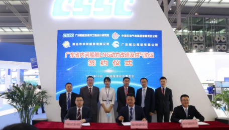 2020年5月,中国船舶集团联合中国海洋石油集团有限公司与广东省人民政府签署了《广东省内河船舶LNG动力改造项目合作框架协议》。本次海博会上,中国船舶集团旗下广州船院与合作伙伴隆重举行“广东省内河船舶LNG动力改造及供气协议”签约仪式。该项目的签约是推动广东省内河航运绿色发展的重要开端,是优化水运行业用能结构,实现转型升级的重要举措。