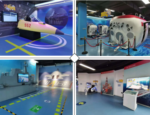 整个展馆内分布着护航体验区、VR综合体验区、航母舰室漫游体验区、近海VR钻井平台体验区、舰载机起飞体感指挥体验区、航母舰载机空体验区等,可以让参观者模拟驾驶我国船海重器,亲身感受搏浪沧海、护卫海疆的震撼与自豪,使得船舶馆成为海洋特色鲜明、模型馆藏丰富、互动体验感强的军事科普教育展馆和军事文化娱乐园区。