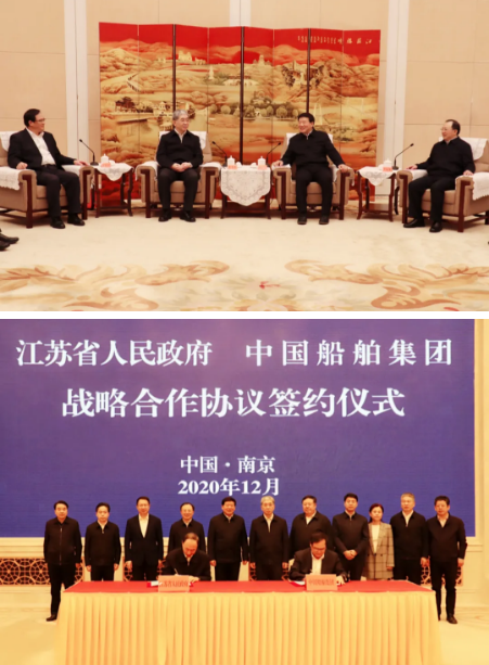 12月21日,中国船舶集团有限公司与江苏省人民政府在南京签署战略合作协议。中国船舶集团党组书记、董事长雷凡培,党组副书记、总经理杨金成,党组成员、副总经理钱建平、杜刚,江苏省委书记、省人大常委会主任娄勤俭,省委副书记、省长吴政隆,省委常委、省委秘书长郭元强,副省长马秋林,省政府秘书长陈建刚等领导出席签约仪式。杨金成、马秋林分别代表双方在协议上签字。签约前,双方围绕共同服务国家战略,就进一步加强交流合作、实现共同发展进行深入交流并达成共识。