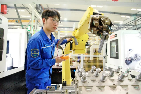 在总装车间,TA替代人工为风电机组的偏航轴承拧紧螺栓。一百多颗螺栓,两个人花上2个多小时才能拧完,TA只需40分钟。TA可用激光识别、校准每一枚螺栓的位置,而且拧紧每一颗螺栓的力度都有记录可查,真正实现了全自动、无人化的操作,且产品质量得到了充分保证。