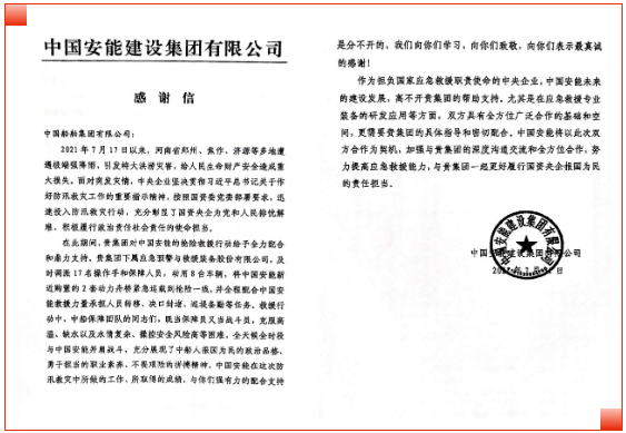 近日,担负国家应急救援职责使命的中国安能建设集团有限公司发来一封感谢信。