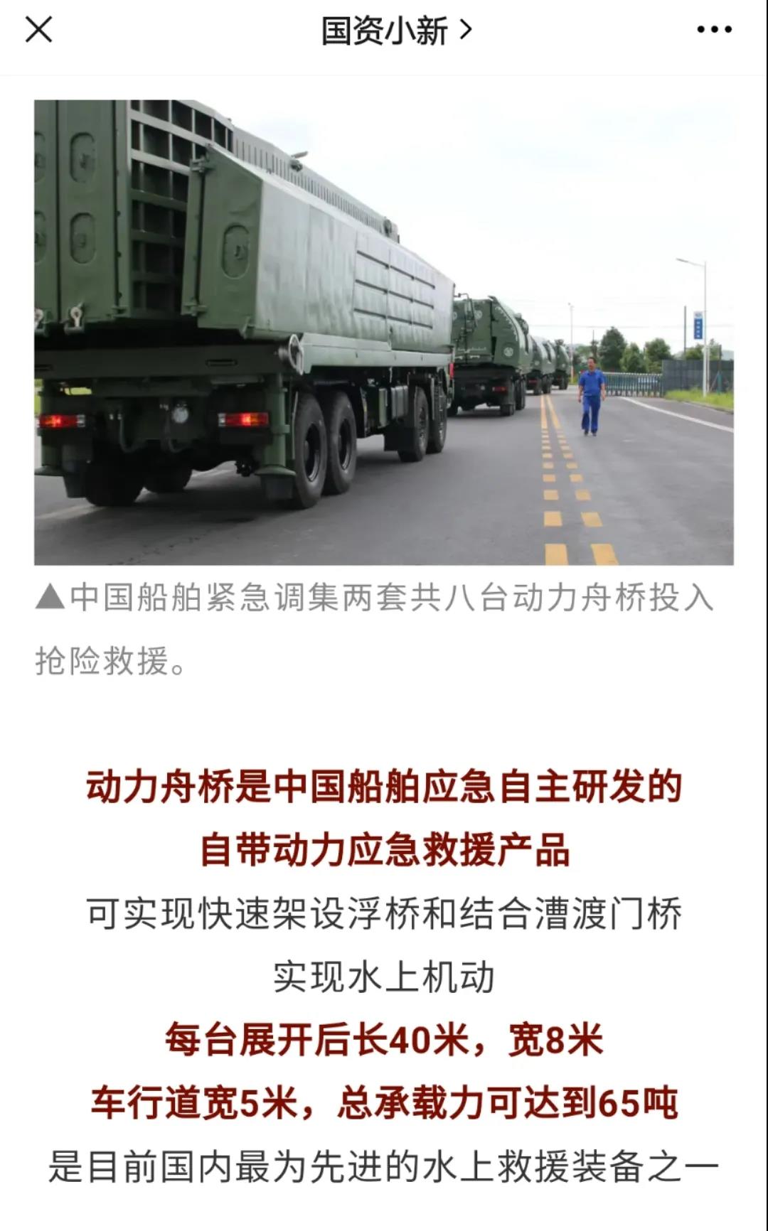 在本次抢险救援任务中,中船应急制造的应急动力舟桥被称作“救援航母”,先后被多家媒体报道多次霸屏。