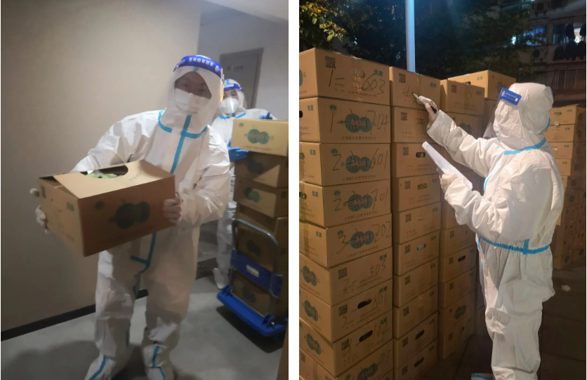 由于防护服有限,居住在黄浦区某社区的集团职工中只有郑珂成了志愿者,只见他时而忙着卸货分装,时而忙着打包标记,7栋楼近400户居民共计几百公斤的物资,都由他一人完成了分装和标记工作。在他服务的对象中,既有身在涉疫楼栋无法出户的同事,也有素未谋面的邻居。