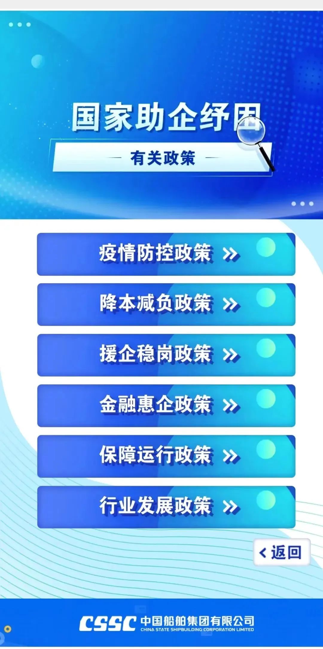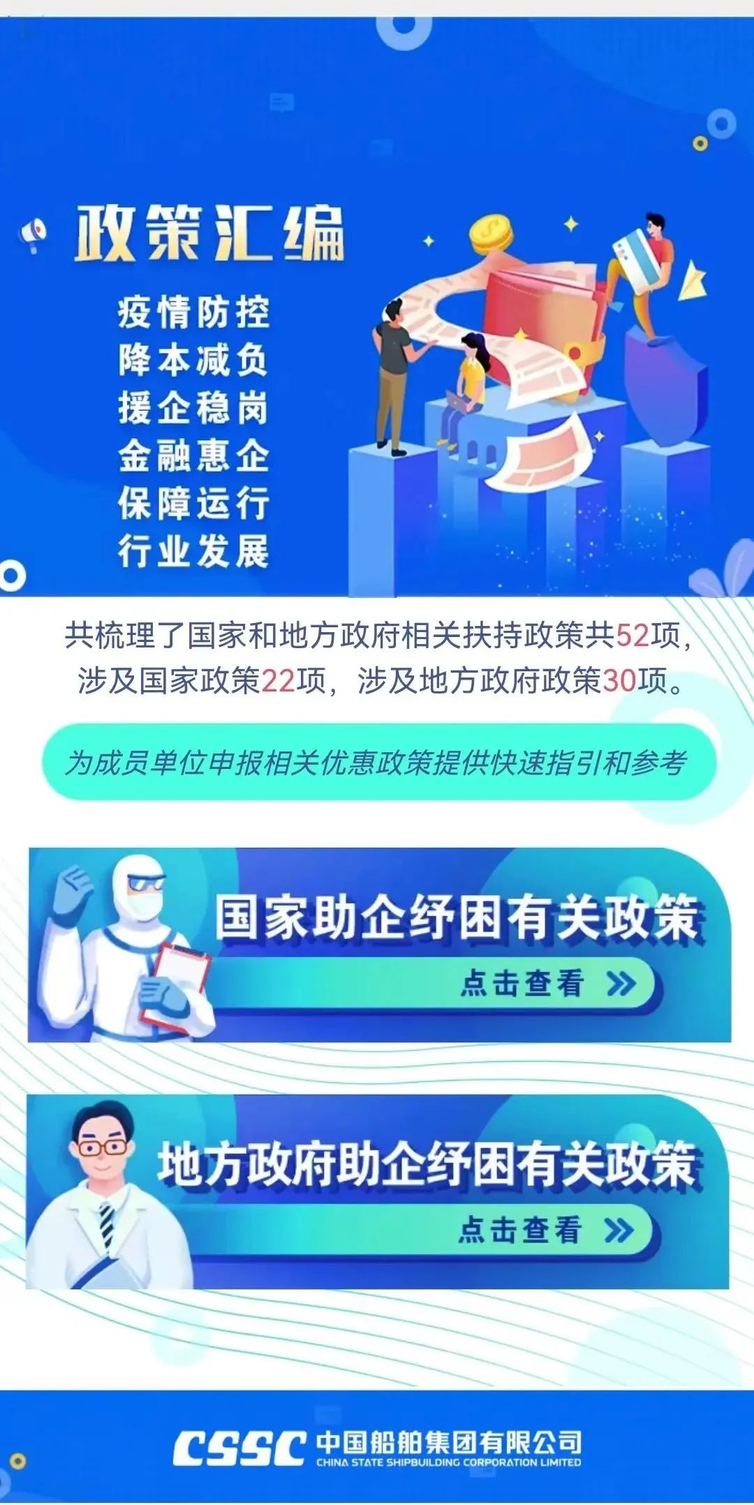 今年新冠疫情发生以来,为支持企业应对疫情防控、加快复工达产,国务院、相关部门、相关地方政府出台了一系列助企纾困政策。集团公司对这些政策进行了梳理,共涉及相关支持政策52项(其中,国家支持政策22项地方支持政策30项),供成员单位查阅参考。 点击阅读原文,了解更多。