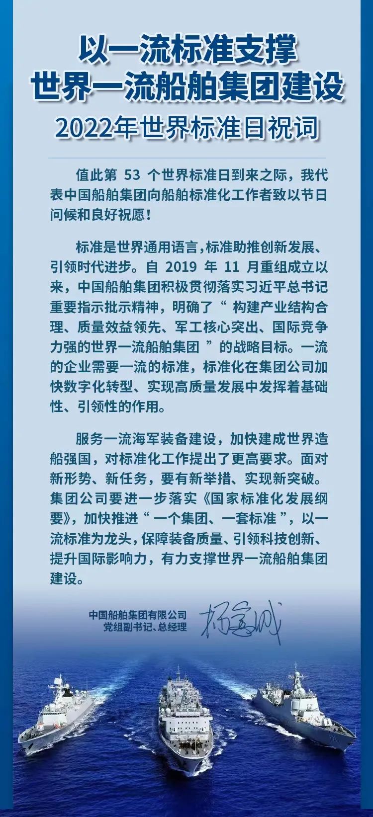 10月14日,中国船舶集团举行第53届世界标准日主题活动,主题为“以一流标准支撑世界一流船舶集团建设”