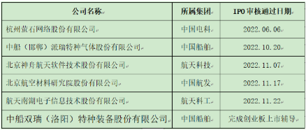 2022年的资本市场,行情不热行业热。从已经公开披露的信息看,2022年中央企业专精特新小巨人在科创板和创业板持续发力,目前已有中无人机(航空工业)、国博电子(中国电科)、振华风光(中国电子)、昆船智能等7家企业IPO上市。此外,截至2022年11月30日,已有多家央企专精特新企业IPO申请通过了科创板上市委审核和创业板上市辅导,其中有两家中国船舶集团旗下企业(见下表)。这些企业将在2023年IPO上市,主要来自船舶、航空、航天和军工电子行业。