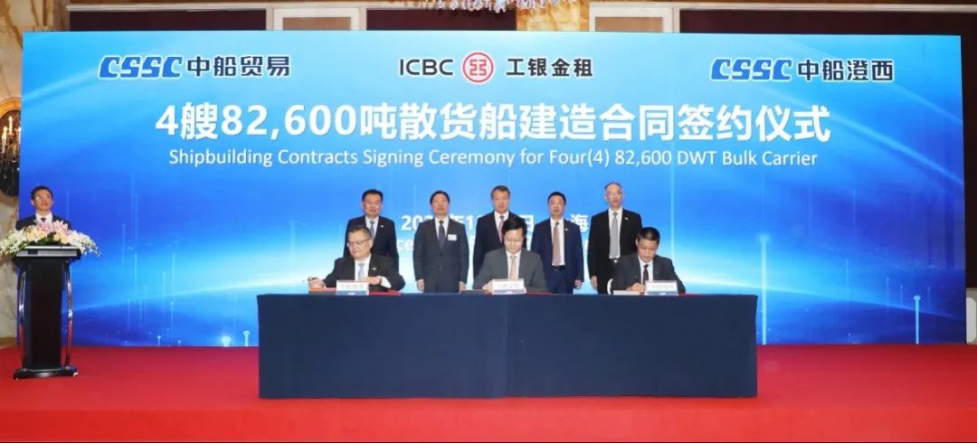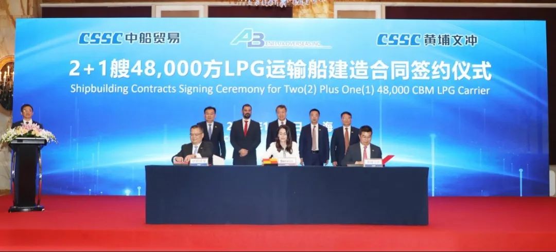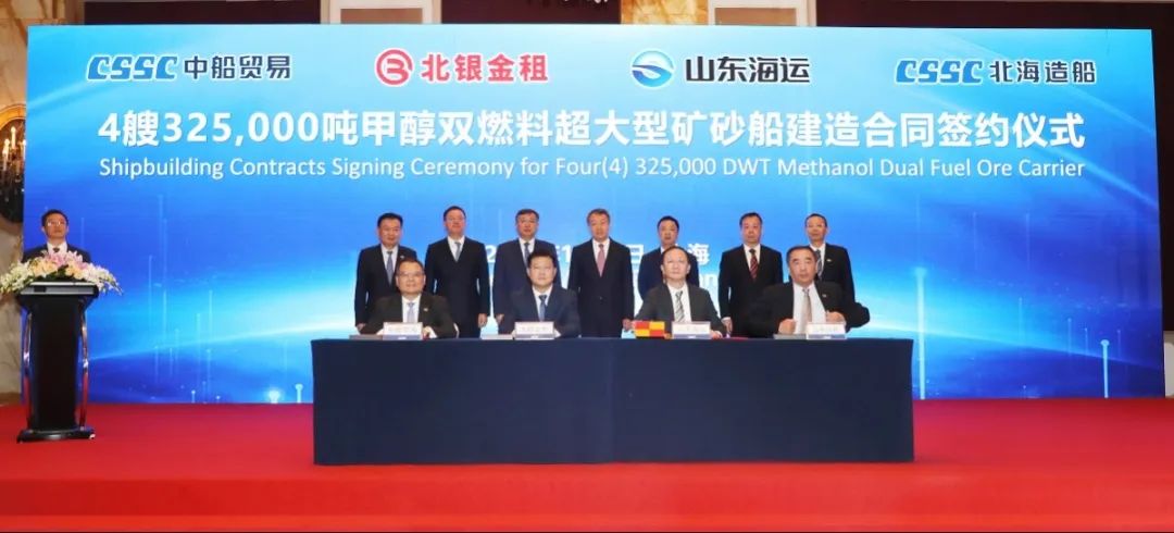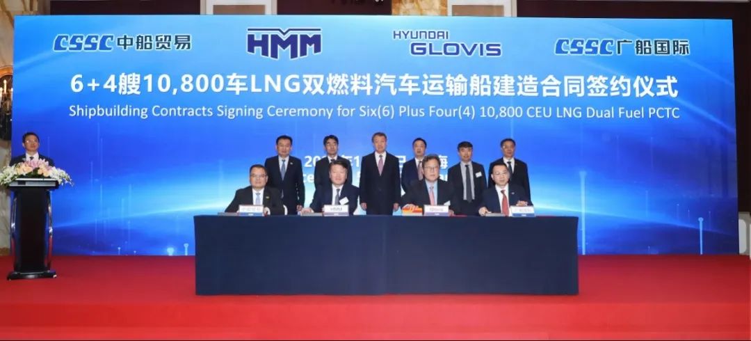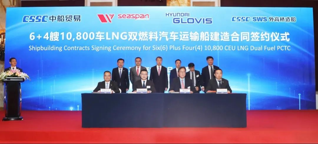 签约仪式上,外高桥造船、中船贸易与Seaspan、现代Glovis签署了6+4艘10800车LNG双燃料PCTC船项目;广船国际、中船贸易与HMM、现代Glovis签署了6+4艘10800车LNG双燃料PCTC船项目;北海造船、中船贸易与北银金租、山东海运签署了4艘325000吨超?型甲醇双燃料矿砂船项目;江南造船、中船贸易与太平洋气体签署了3艘99000方VLEC船项目;黄埔文冲、中船贸易与Benelux公司签署了2+1艘48000方LPG船项目;中船澄西、中船贸易与工银金租签署了4艘82600吨散货船项目;大连造船与七二五所青岛双瑞签署了15000TEU集装箱船甲醇供应系统项目。