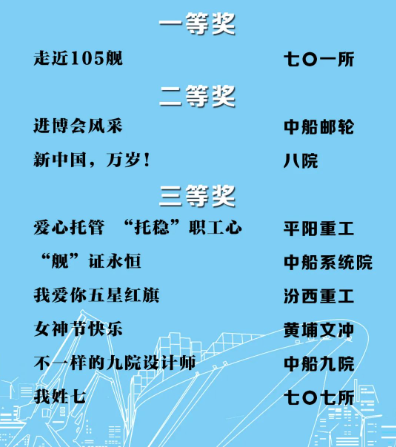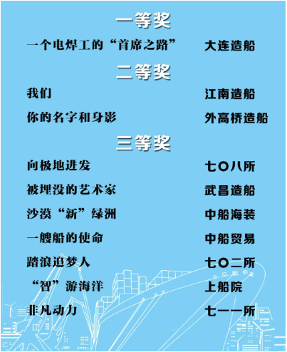 由中国船舶集团党群工作部指导,中国船舶集团新闻宣传中心/中国船舶报社承办的中国船舶集团第二届短视频大赛圆满落幕。经过前期筛选,网络投票,并特邀国务院国资委新闻中心、国防科工局新闻宣传中心、中央电视台、微博政务、中国船舶集团党群工作部专家评审,大赛最终评出一等奖5部,二等奖10部,三等奖23部,同时评出优秀组织奖单位6家。名单如下,快来围观!