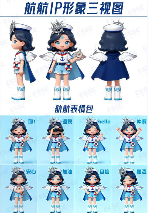 建建(造船担当)以银色防护头盔(嵌船舶零件电子屏、印舰船剪影)、船锚腰带、CSSC工装及焊枪,凸显造船匠心精神;航航(航行担当)凭船舵头饰、导航罗盘、海鸥披风与船锚上衣,传递中船航行使命。二者以 “建造 - 航行” 闭环,具象中船全链条实力,彰显中船文化。