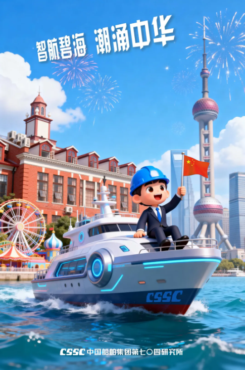 海报以七〇四所标志性建筑“小红楼”和上海市地标为背景,AI 生成的卡通工程师乘坐智能船舶破浪前行,手持国旗彰显科技自信。