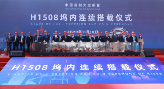 大型邮轮工程是中国船舶集团贯彻习近平总书记重要指示精神、落实国家战略、满足人民美好生活需要的重大举措,也是中国船舶集团强化科技创新、促进转型升级、推动高质量发展的一号工程。2018年11月6日,中国船舶集团与美国嘉年华集团、意大利芬坎蒂尼集团在首届中国国际进口博览会上正式签订2+4艘13.5万总吨Vista级大型邮轮建造合同,并举行了中国船舶集团大型邮轮项目工程正式启动仪式。这是我国首次签订真正意义上的大型邮轮建造合同,开启了中国船舶工业建造大型邮轮的新时代。2019年10月18日,中国首制大型邮轮在外高桥造船正式开工点火进行钢板切割,全面进入实质性建造阶段。一年多来,在中国船舶集团的坚强领导下,在中船邮轮科技发展有限公司、中船第九设计研究院工程有限公司、上海船舶工艺研究所等兄弟单位的大力支持下,外高桥造船经受住了新冠肺炎疫情的洗礼和考验,克服了物资采购、薄板车间流水线建设滞后等一系列困难,一步一个脚印,如期实现了坞内连续搭载总装的里程碑节点。