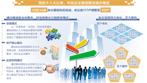 党的十八大以来,中央企业的重组整合,成为国企改革的重要内容。5年来,中央企业的重组整合稳步推进,国务院国资委先后完成18组34家央企重组,央企由117户调整至98户。