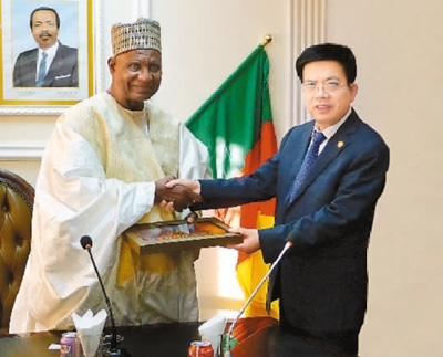 陕西建工集团党委书记、董事长、总经理张义光(右)拜会喀麦隆旅游部长贝洛?布巴?迈加里先生(蔺进士 摄)