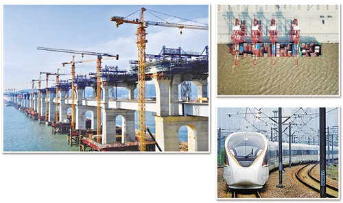 图① 平潭海峡公铁两用大桥是我国第一座公铁两用跨海峡大桥。图为平潭海峡公铁两用大桥正在加紧施工。 新华社 张国俊摄