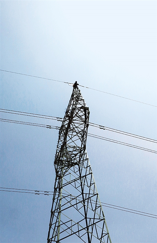 一名电工爬上一座电网塔基进行检修。这条331公里的输电线路是新疆东南部且末县和若羌县10万多居民用电的主要凭借。