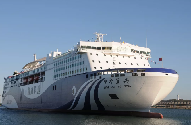 ????“中华复兴”号总长212米,型宽28.6米,总吨4.4万,装载车道长度3070米,3层车辆舱,服务航速18.8节,最大续航力5000海里。 拥有双套船舶动力系统、双电源系统、双套灭火系统,有良好的设计稳性和船体强度,满足减振降噪、节能环保等最新国际规范要求。 载客定额为1689人,客房全部采用等级舱位,设有大型多功能演艺厅、儿童游乐区、购物中心、影院等娱乐休闲场所,集旅行、休闲、娱乐于一体,为旅客带来邮轮般体验。