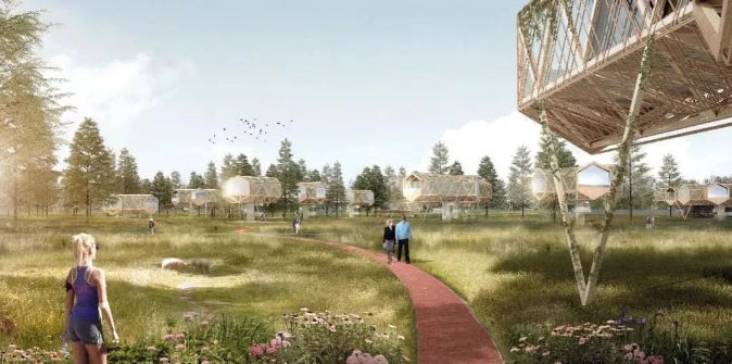 ????“棠上人家”方案以“浮木”为概念,旨在创造一种漂浮于自然之上、如树木般生长的建筑形态。设计以乡村建设的天然环境保护和不规则点状供地特点为切入点,提出立足乡村、面向未来的轻型建造策略,对结构选型、空间组合、表皮构造等方面进行研究,打造绿色生态的新型乡村建筑形态。