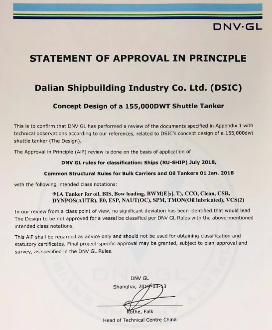 ????11月20日,大船集团在总部举行了“15.5万吨穿梭油船”和“通用型FPSO”设计AIP证书颁发仪式,两型新产品获得DNV·GL原则性认可。