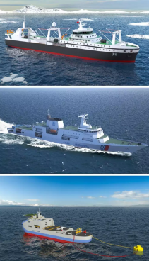 图1:南极磷虾捕捞加工船效果图;图2:首艘万吨级海事巡逻船效果图;图3:首个民用涉核总体设计项目效果图。