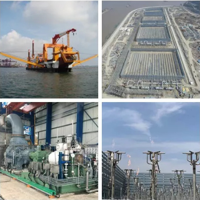 左上:装有七一一所传动装置的挖泥船;左下:816压缩机;右上及右下:浙石化火炬航拍及近景图。