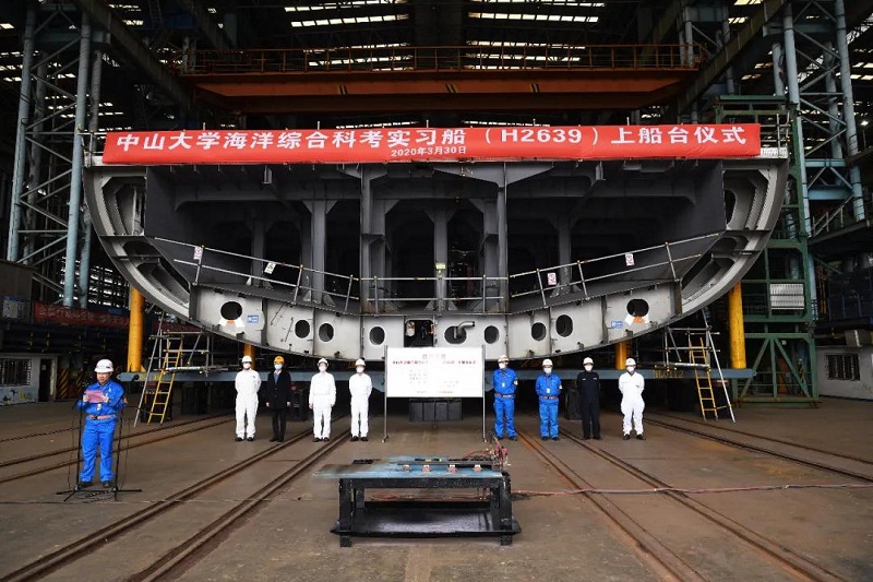????3月30日,由中国船舶集团七〇八所设计、江南造船建造的中山大学海洋综合科考实习船顺利上船台。该型船是国内目前最大的海洋综合科考船,总长约114.3米,排水量约6800吨,续航力15000海里,入级中国船级社(CCS);具备B3冰级加强,采用直流母排+蓄电池储能技术,配有齿轮全回转主推进装置、轮缘永磁侧推装置,具备DP1动力定位能力,是一艘配置高、能力强、创新技术高度集成的新一代大型海洋综合科考船。