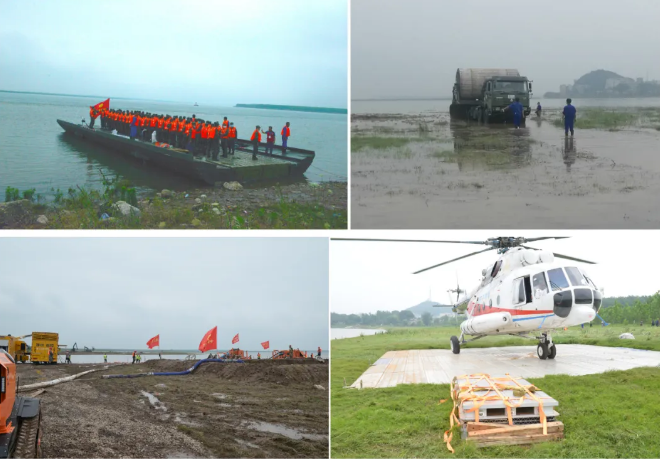 ????在搜救环节,中船应急抢险队架设动力舟桥和硬质机动路面进行道路抢通,保障重型装备及人员进场;在内涝抢排环节,采用应急泄流虹吸装备和履带式排涝机器人参与排涝抢险;在重大险情处置环节,铺设应急直升机停机坪保障直升机起降,并实施溃口封堵作业。