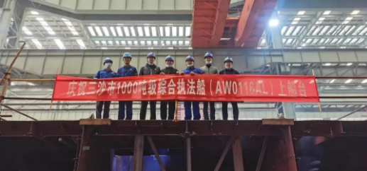 ????这是三沙市1000吨级综合执法船首制分段上船台,武船集团仅用12个工作日就保质保量完成了首制分段的制造及全部预舾装工作。