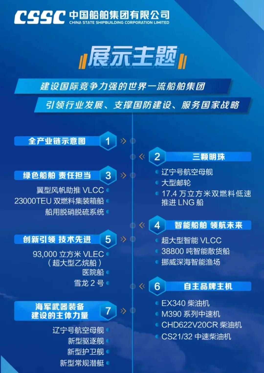 船舶海工装备产业展区 分为船舶与海洋工程、船舶配套2个大区,整体展示了中国船舶集团强大的船舶建造能力。船舶与海洋工程分为海洋运输与工程装备,海洋资源开发、海洋科考装备,海洋渔业,新开发船型与船舶改装等六大板块;船舶配套区包括动力与配套、机电装备和电子信息装备3大部分,共展出模型及实物68个,重点聚焦自主品牌、系列化产品及国际领先产品,展示了中国船舶集团在业界最为完整齐全的船舶动力机电配套产业链,具备提供稳定、可靠的全动力和配套解决方案的能力。