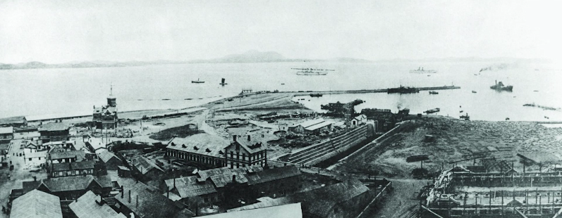 修船南坞始建于1899年,1902年底初建完工,长116米、宽13米、深7.6米,采用两开式扉门,并配备电动排水泵。