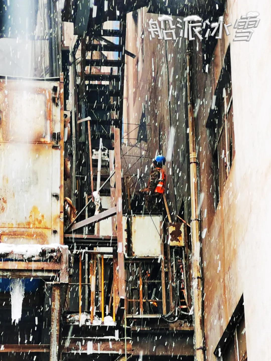 “雪花飘、北风萧,寒梅立雪只为船人香!”抚钢项目组成员在抚顺现场冒雪施工。