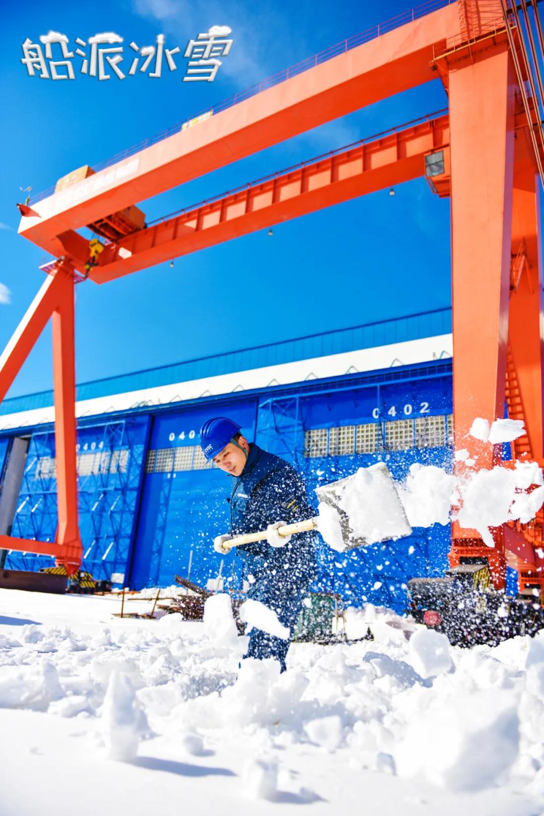 过膝的大雪掩埋了吊车的轨道,渤船小伙抄起“家伙”,为吊车开道,胳膊抡圆,雪花纷飞,别说这画面还真有点浪漫了。