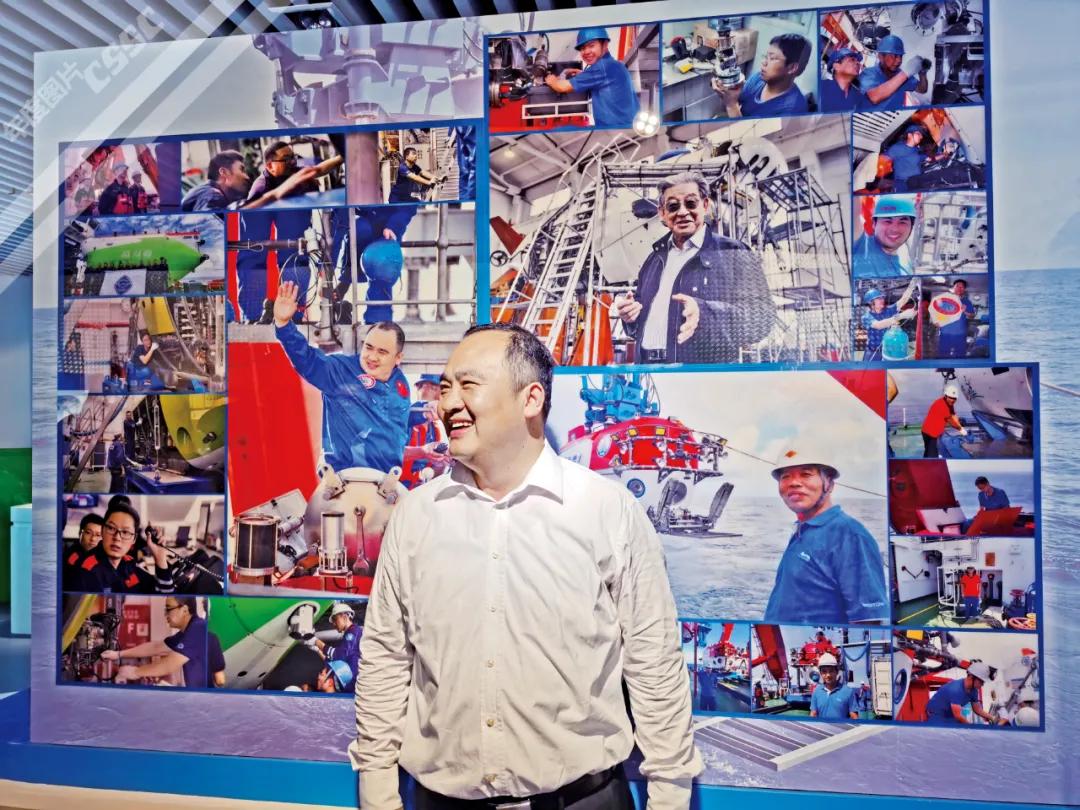 国企开放日期间, “奋斗者”号总设计师叶聪带领众多央媒记者走进中国船舶、深入船人一线,感受大国重器的张力!在展览室的背景墙前,他纵然一笑,撒下江湖传说。