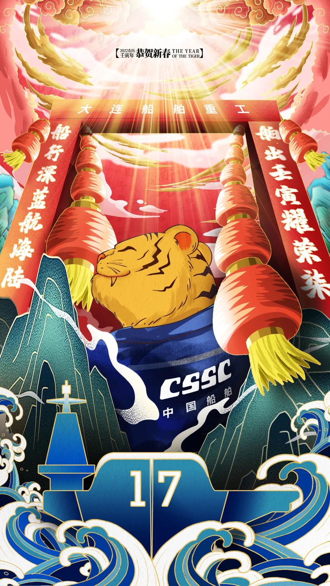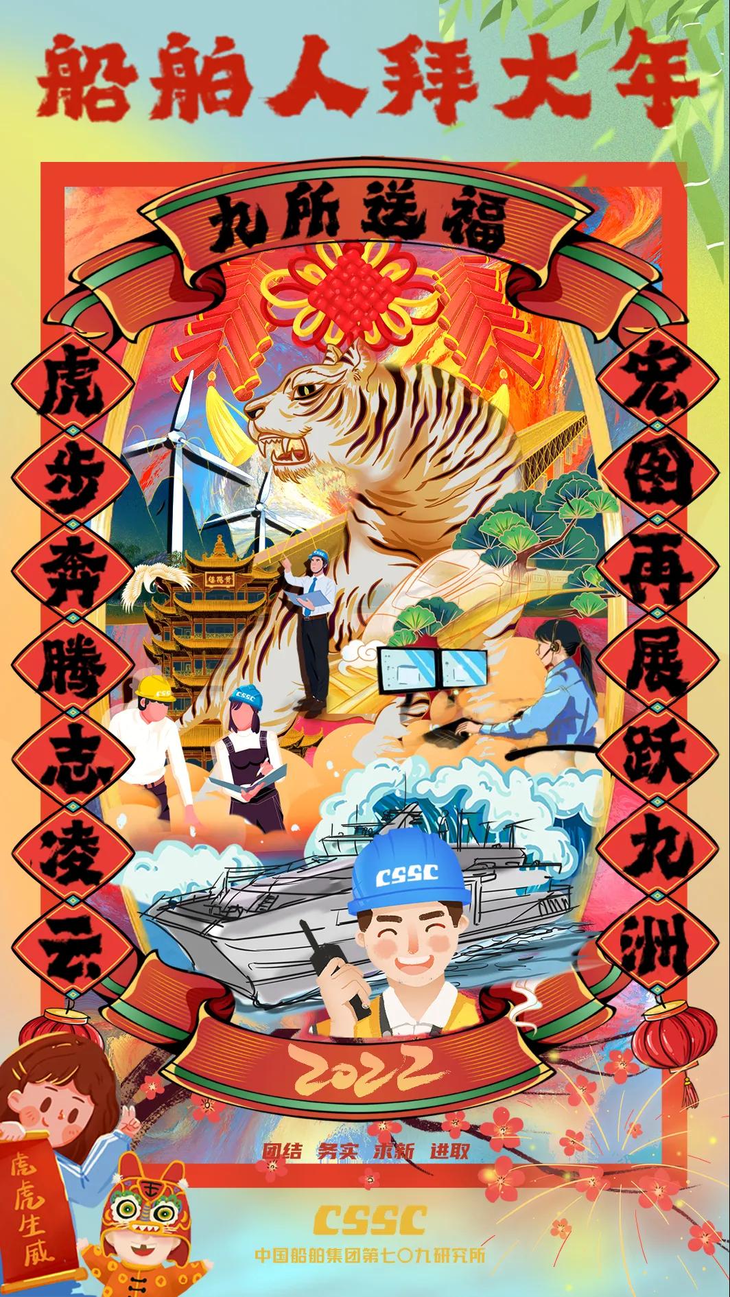 海报采用国潮画风,中间部分“江小南”穿着新衣举着虎头,寓意新的一年中国船舶人虎虎生威,上面部分以重要产品和厂区设备为主,诠释江南造船建造国之重器的初心和使命,同时辅以鞭炮、烟花、灯笼等新年元素,使海报充满喜庆祥和的新年氛围。