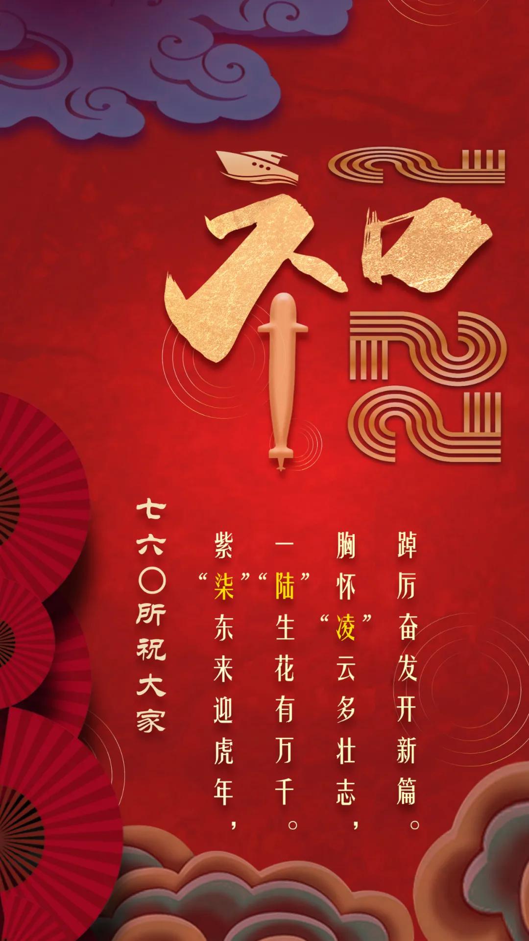 海报将船、潜艇、2022与“福”字巧妙地融为一体。“福”字中的船和潜艇,旨在致敬核潜艇精神、航母精神;“2”被设计成跑道形状,代表着七六〇所要在2022年踔厉奋发、笃行不怠,为建设世界一流船舶集团贡献更多力量!