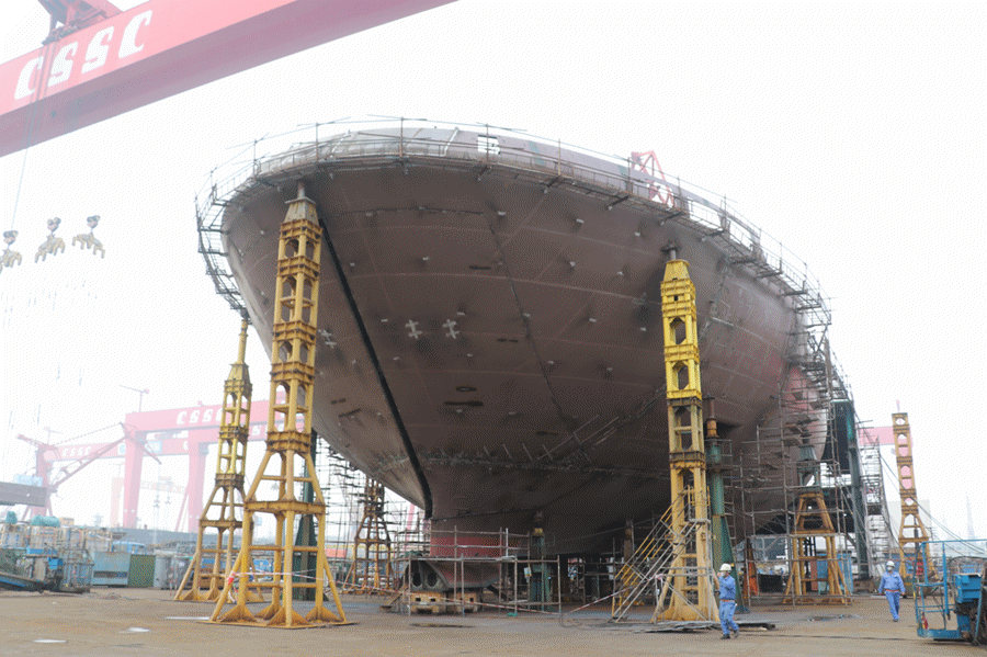 中国船舶集团旗下广船国际为中远海客建造的3000米车线货滚船2号船在总组阶段进行开启艏门作业。一座钢铁巨兽幼兽在液压驱动下缓缓“张开大口”。这一工艺技术变革在全球尚属首例。