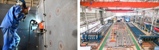 以U肋双面全熔透焊接技术和先进视觉识别焊接机器人技术为基础,全新规划了国内建设规模最大、建设标准最高、配套最完善的桥梁板单元智能制造车间,解决钢桥正交异性钢桥面板结构疲劳病害等技术难题。