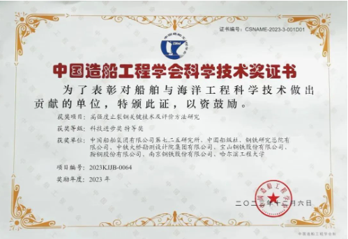 近日,中国造船工程学会发布了2023年科学技术奖评审结果,中国船舶集团七二五所申报的“高强度止裂钢关键技术及评价方法研究”荣获科技进步奖特等奖。项目团队历经十余年技术攻关,在国际上首次提出了止裂性能大尺寸双重拉伸试验方法和小尺寸替代试验方法,并成功将其纳入国际船级社协会(IACS)通用规范,极大提升了我国在该领域的国际话语权和技术影响力。